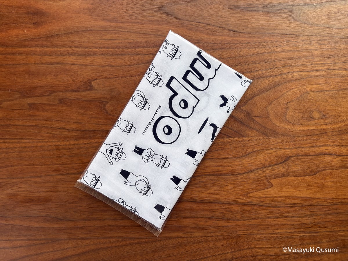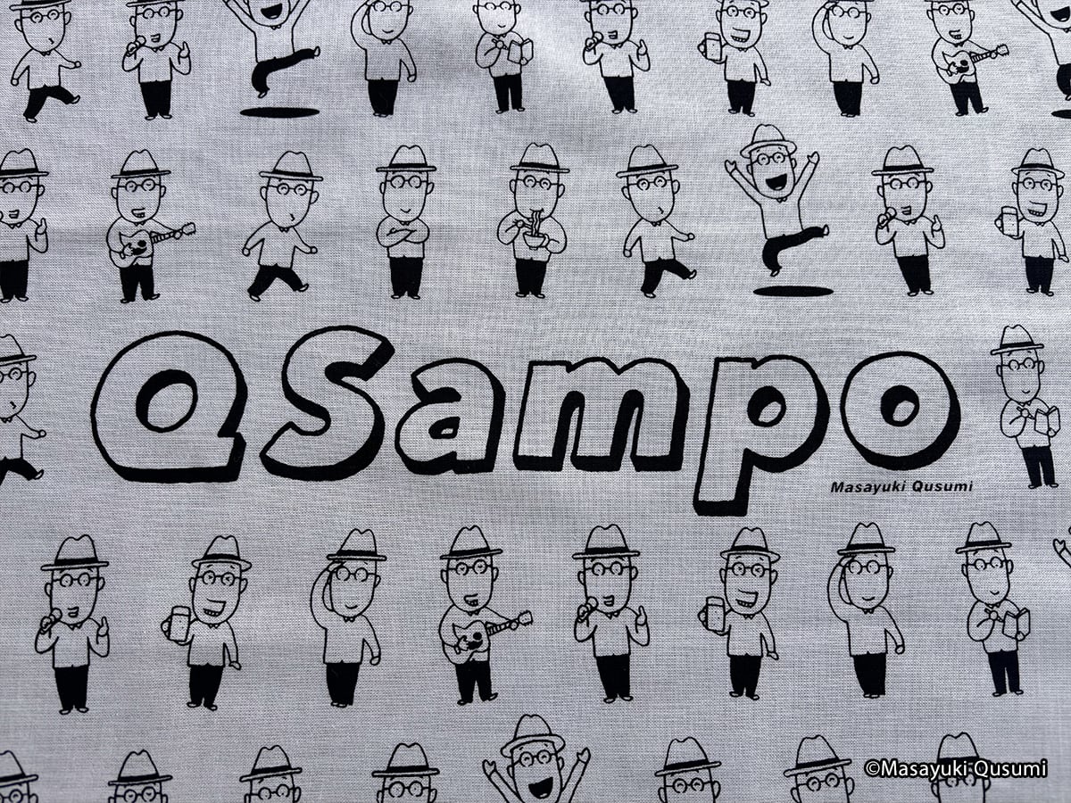 Qsampo Tシャツに続く、いろんなQさんが散歩している図がたくさん散りばめられた手ぬぐいです。白地に鉄紺ですっきりとした色合い。